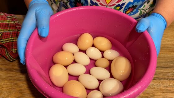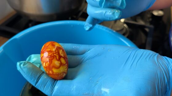 Najpierw jajka są moczone, by łupiny cebuli lepiej się do nich przyczepiły. Następnie owija się je w materiał – może to być stara bluzka, rajstopy czy ścierka – i gotuje w wywarze z cebuli.