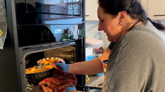 W przygotowaniach uczestniczy cała rodzina – dzieci mąż pomagają przy obieraniu cebuli i zawijaniu jajek, a w tle przewijają się psy i kot Garfield.